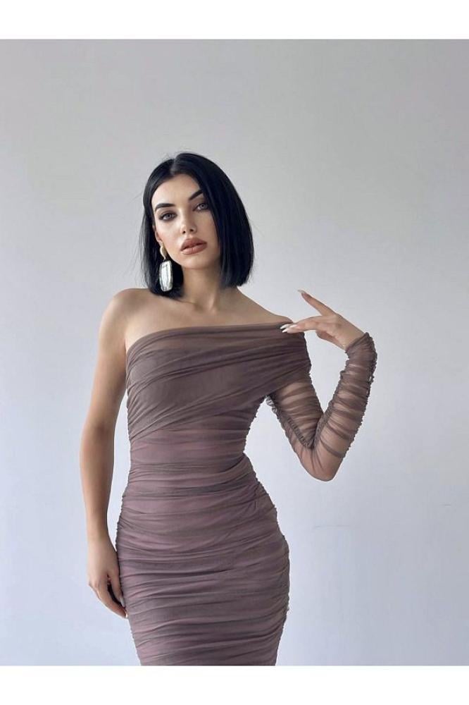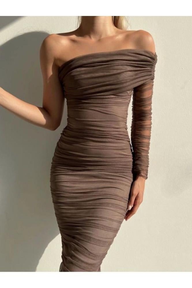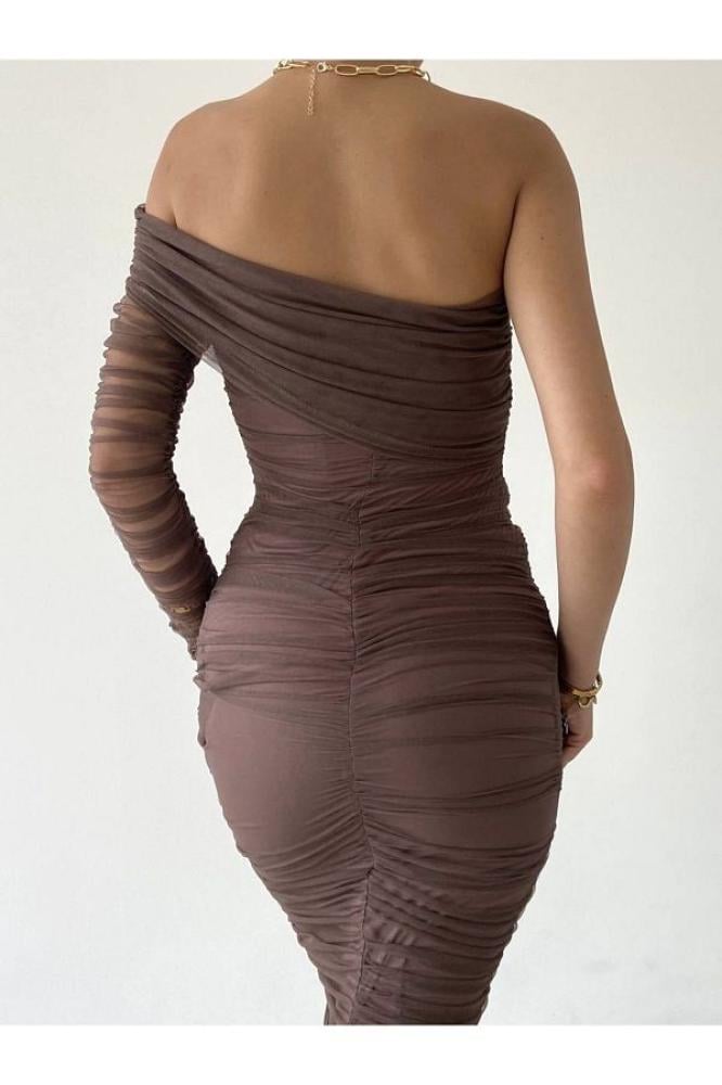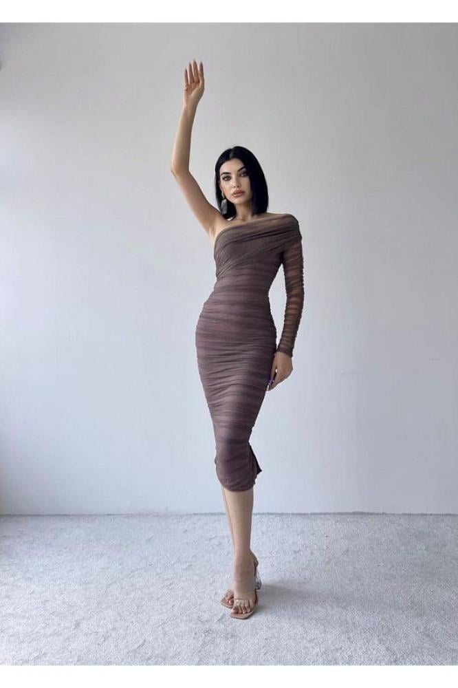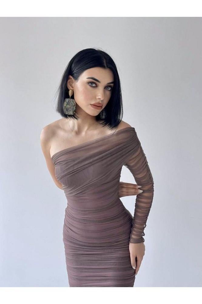 فستان سهرة بني بكتف واحد وتصميم درابيه